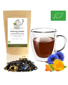 Composition: thé noir Assam, huile d'orange, écorces d'orange, huile de bergamote, écorces de bergamote, fleurs de souci, fleurs de bleuet.